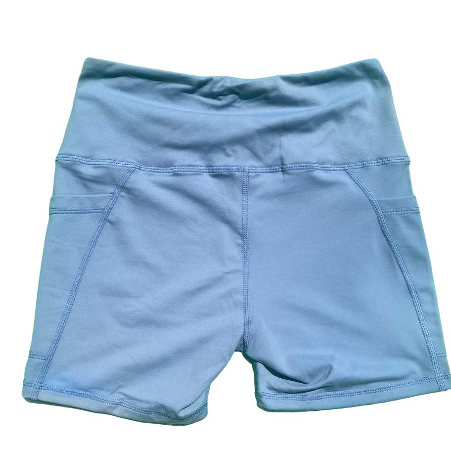 Blue-Grey Biker Shorts that include pockets on either side. Made to be Comfortable for Liesure or when youre Active.